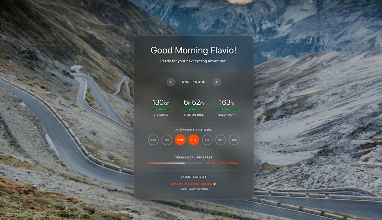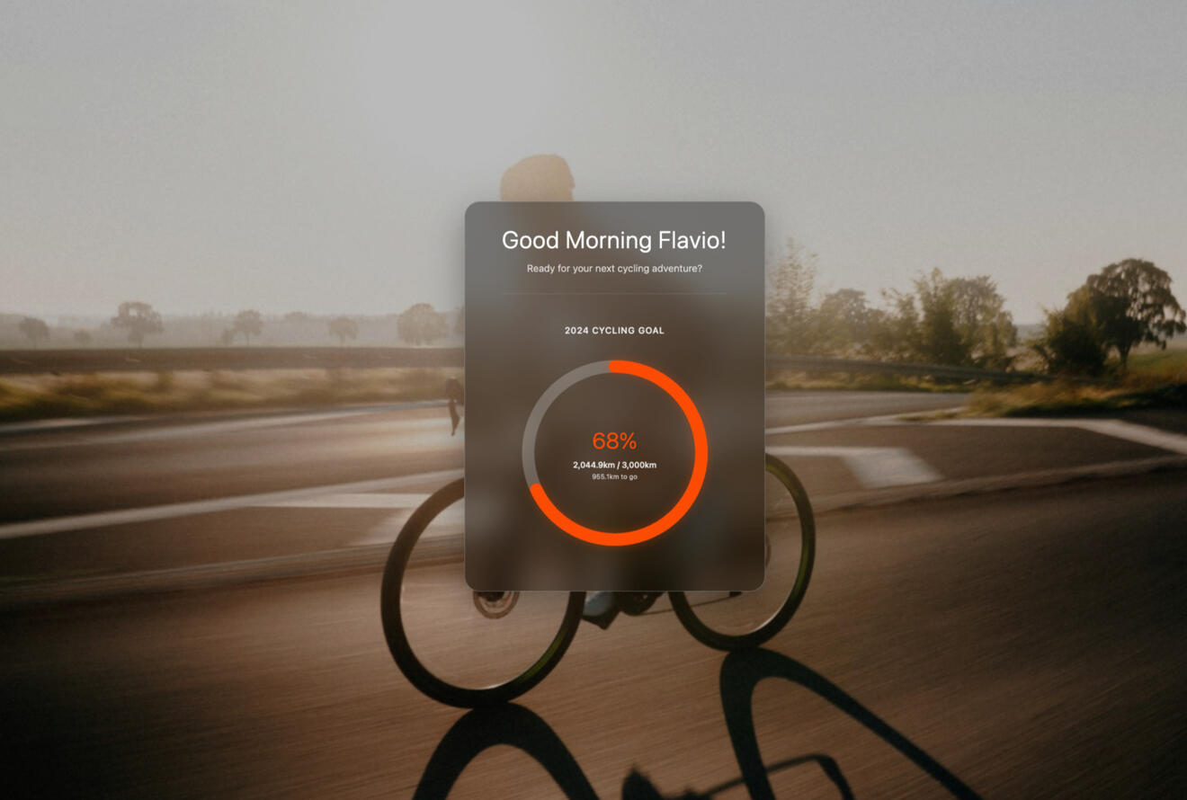 Transform each new tab into your personal cycling achievement gallery.Your most important stats, visualized clearly β and beautifully.
